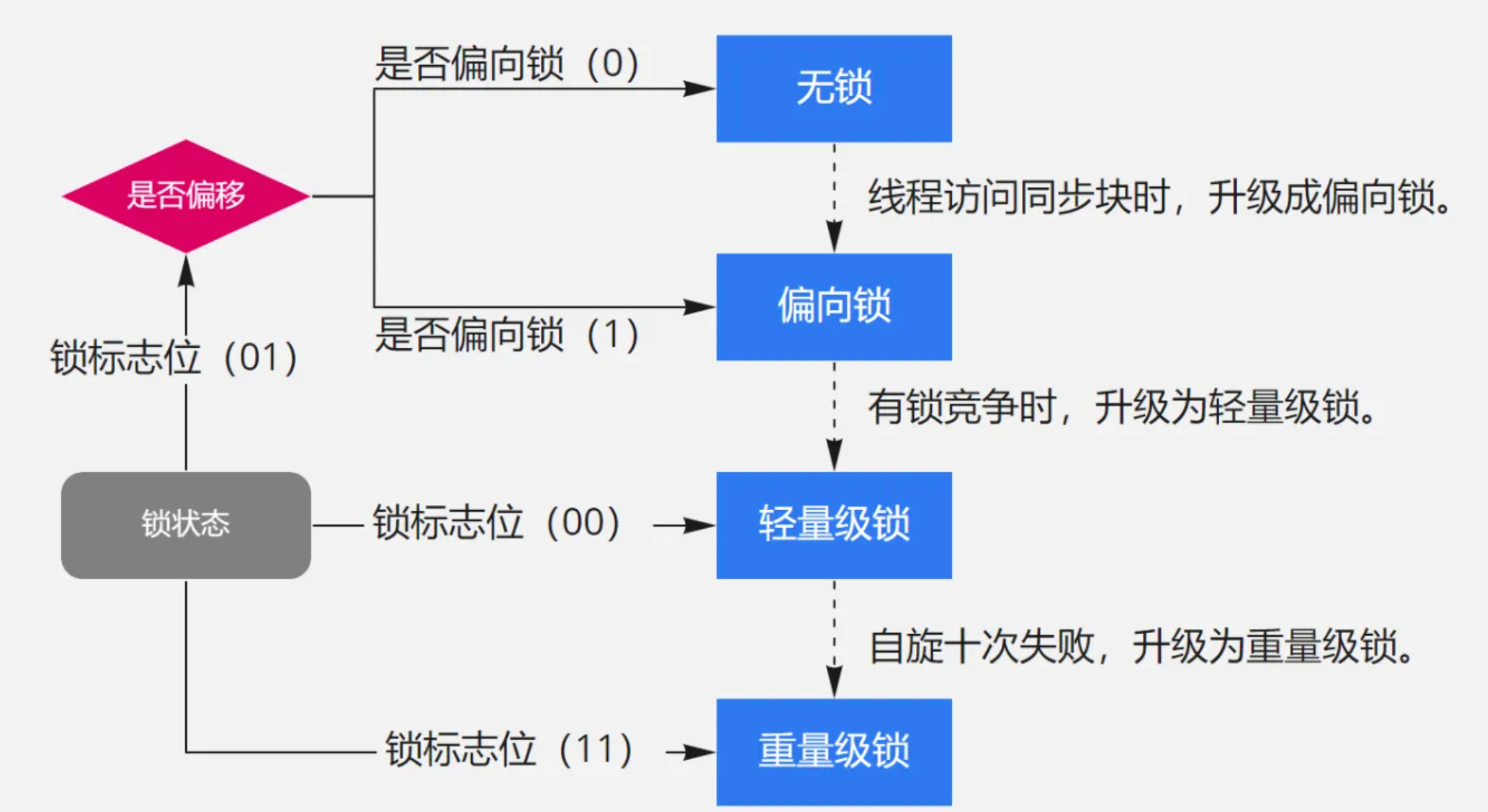 - synchronized 和 ReentrantLock:两者的区别、锁升级的过程(偏向锁 → 轻量级锁 → 重量级锁)、以及 AQS 是什么、怎么实现的,这条线是并发面试的核心主线。