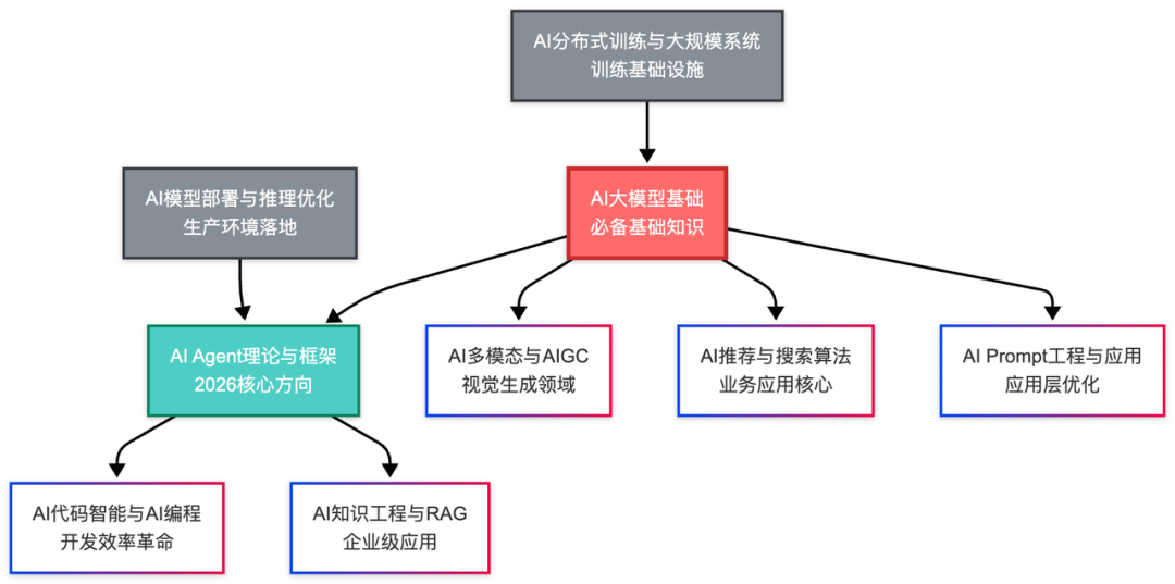距离2026春招只剩4个月。我们分析了2025年Q4腾讯、阿里、字节等大厂的200+个AI岗位JD,发现一个清晰的信号:AI技术岗位的要求正在收敛。不管岗位名称如何,底层考察的技术能力已经形成了明确的九大方向。更关键的是,这九个方向不是孤立的知识点堆砌,而是一个有机的知识网络。