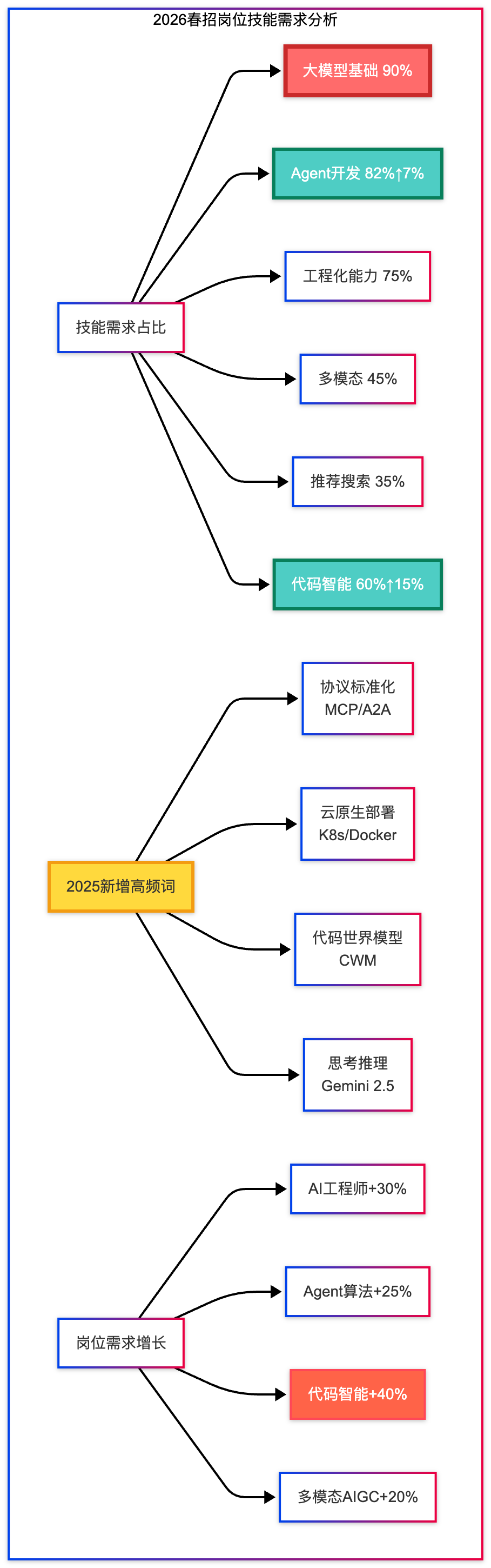 我们对200+个岗位JD的深度分析发现:90%以上要求大模型基础,82%要求Agent开发能力(相比去年提升7%),垂直方向则根据业务分化为多模态、推荐搜索、代码智能等,而工程化能力(分布式训练、模型部署)是所有方向的底座。