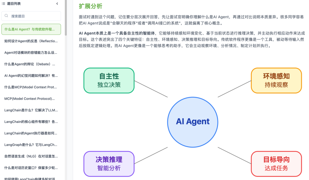 题库覆盖:Agent理论框架(30%)→ LangChain/LangGraph实战(40%)→ Multi-Agent协作与MCP协议(30%)