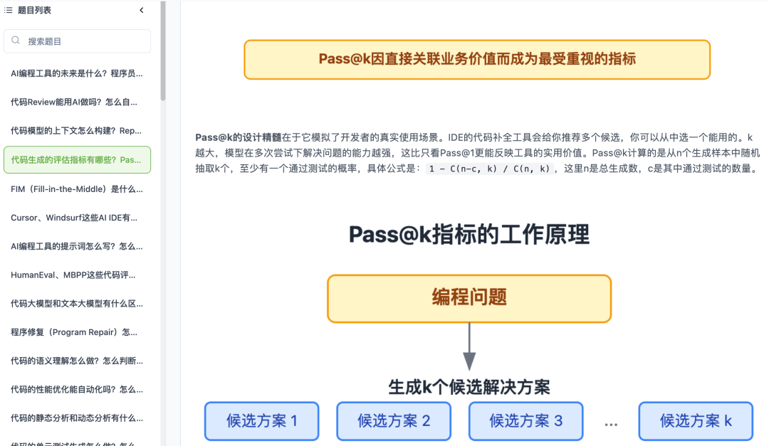 题库覆盖:代码理解与生成(40%)→ 代码Agent(Code Review/测试生成/自动修复)(30%)→ Codex/StarCoder等代码模型(30%)
