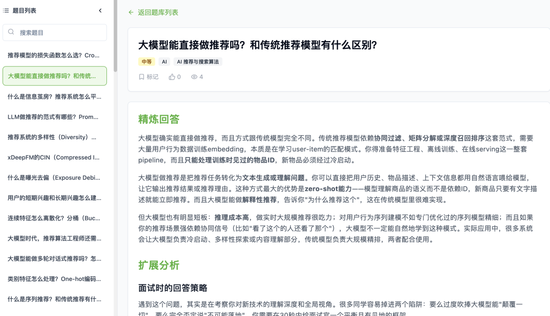 模拟真实面试场景,考察跨领域融会贯通、开放性问题(如"设计一个推荐系统")、项目深挖连环追问、STAR结构化表达,暴露薄弱环节后回到题库循环提升。