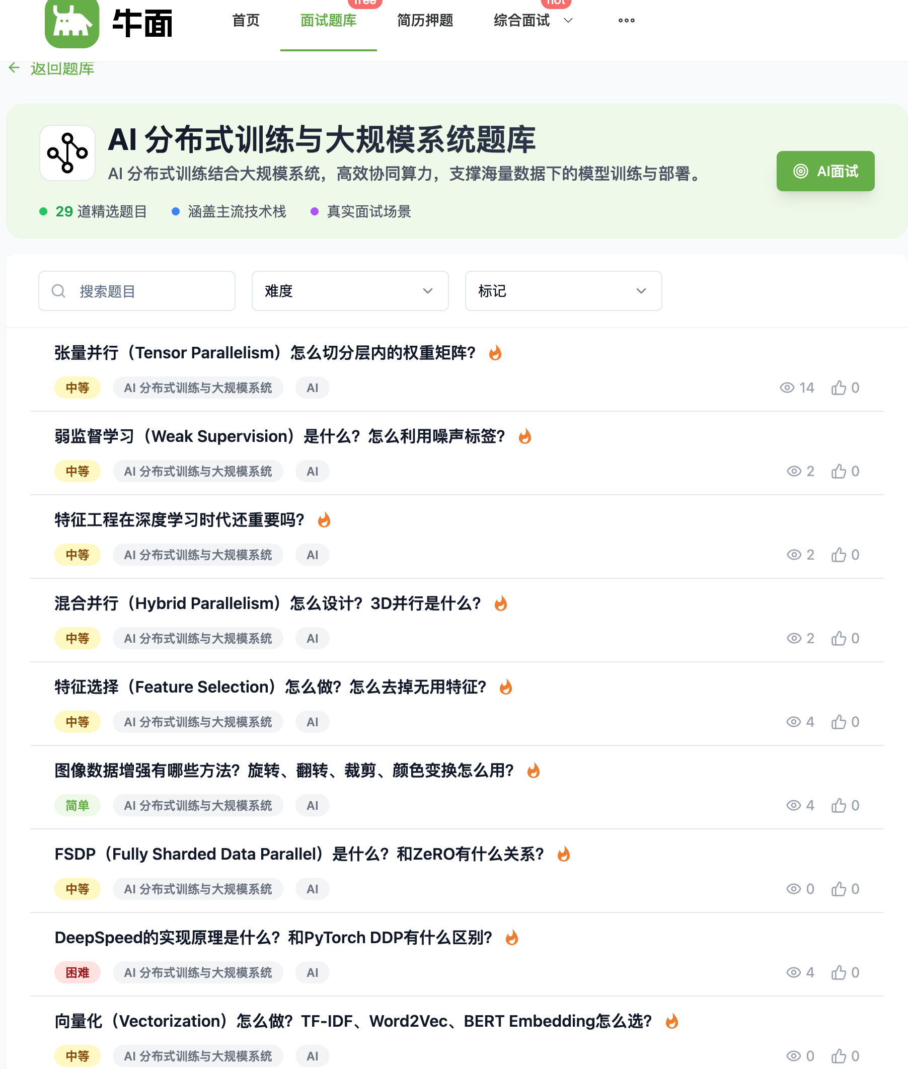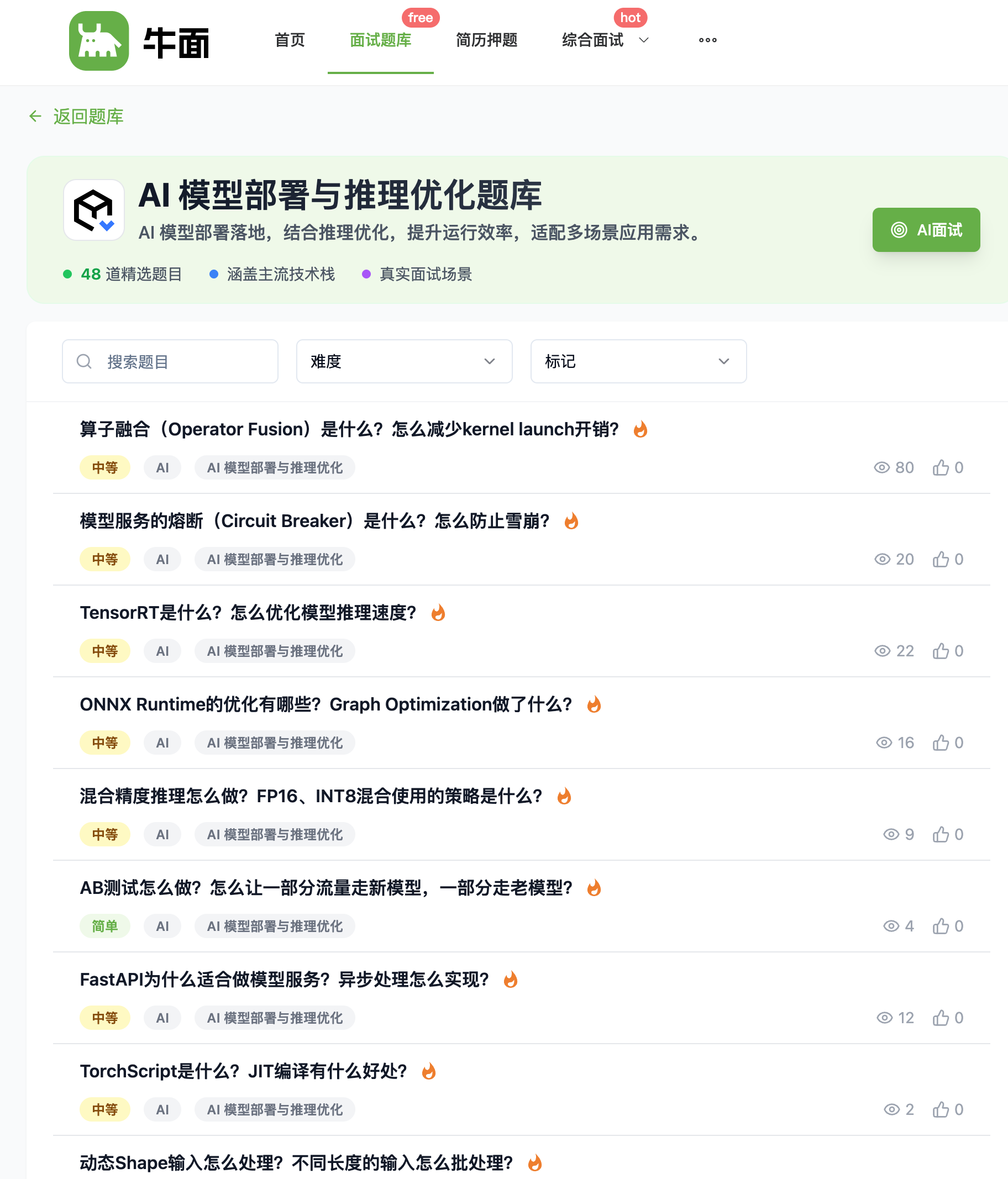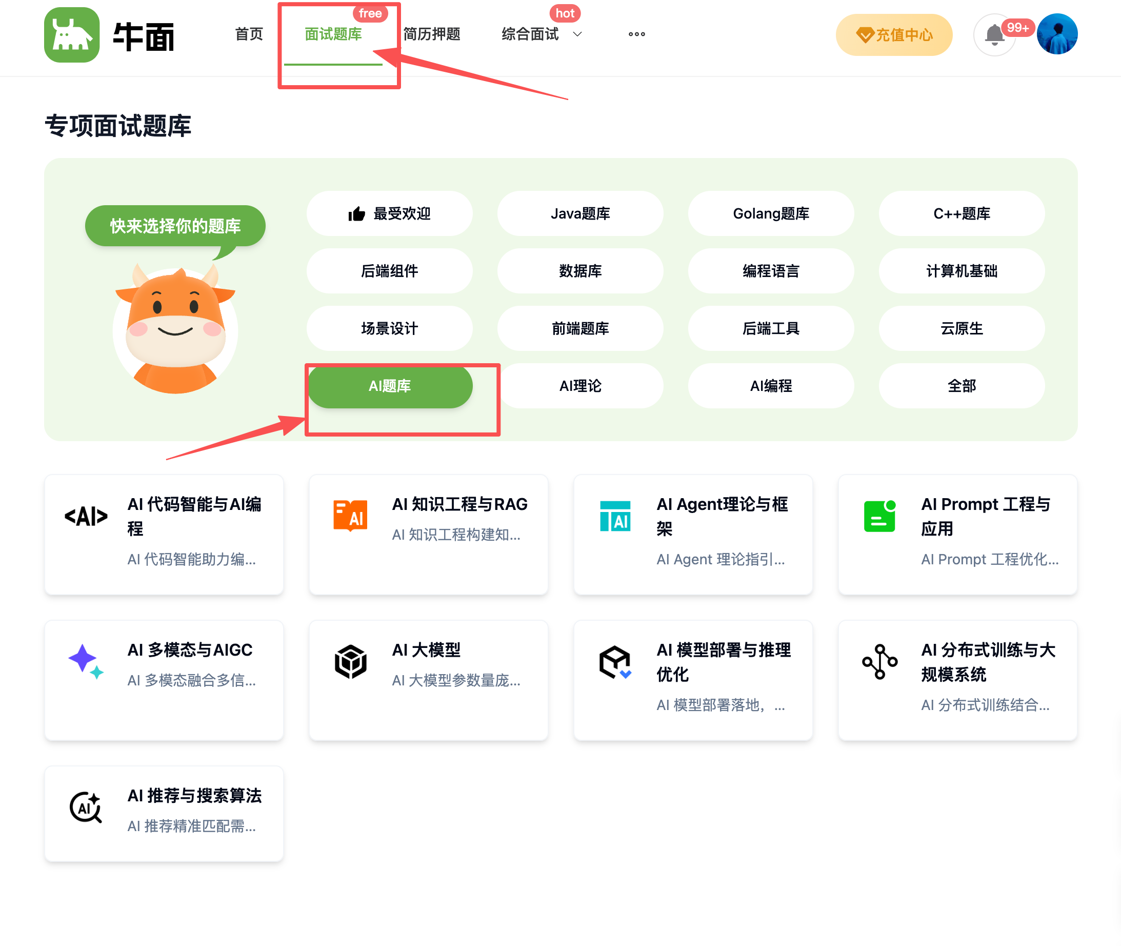 访问「niumianoffer.com (opens new window)」可以免费获取,顶部菜单选择【面试题库】,然后选择【AI题库】