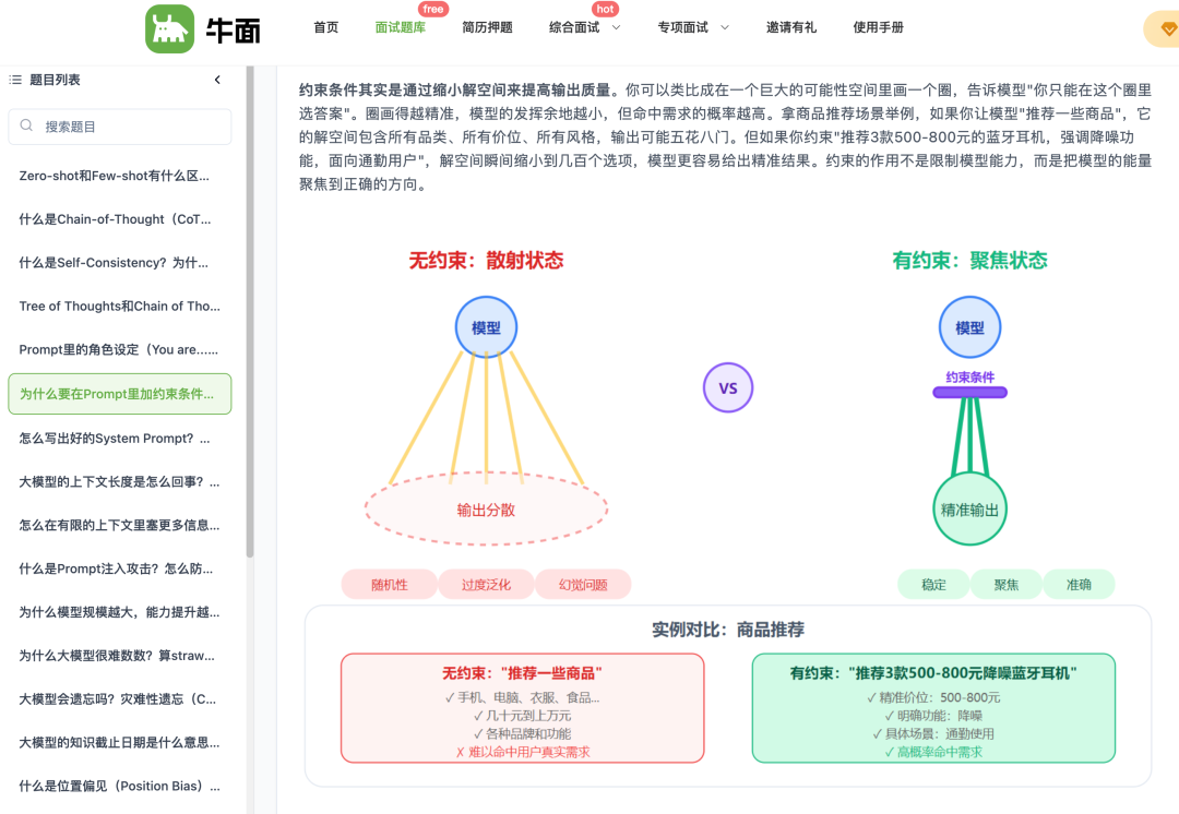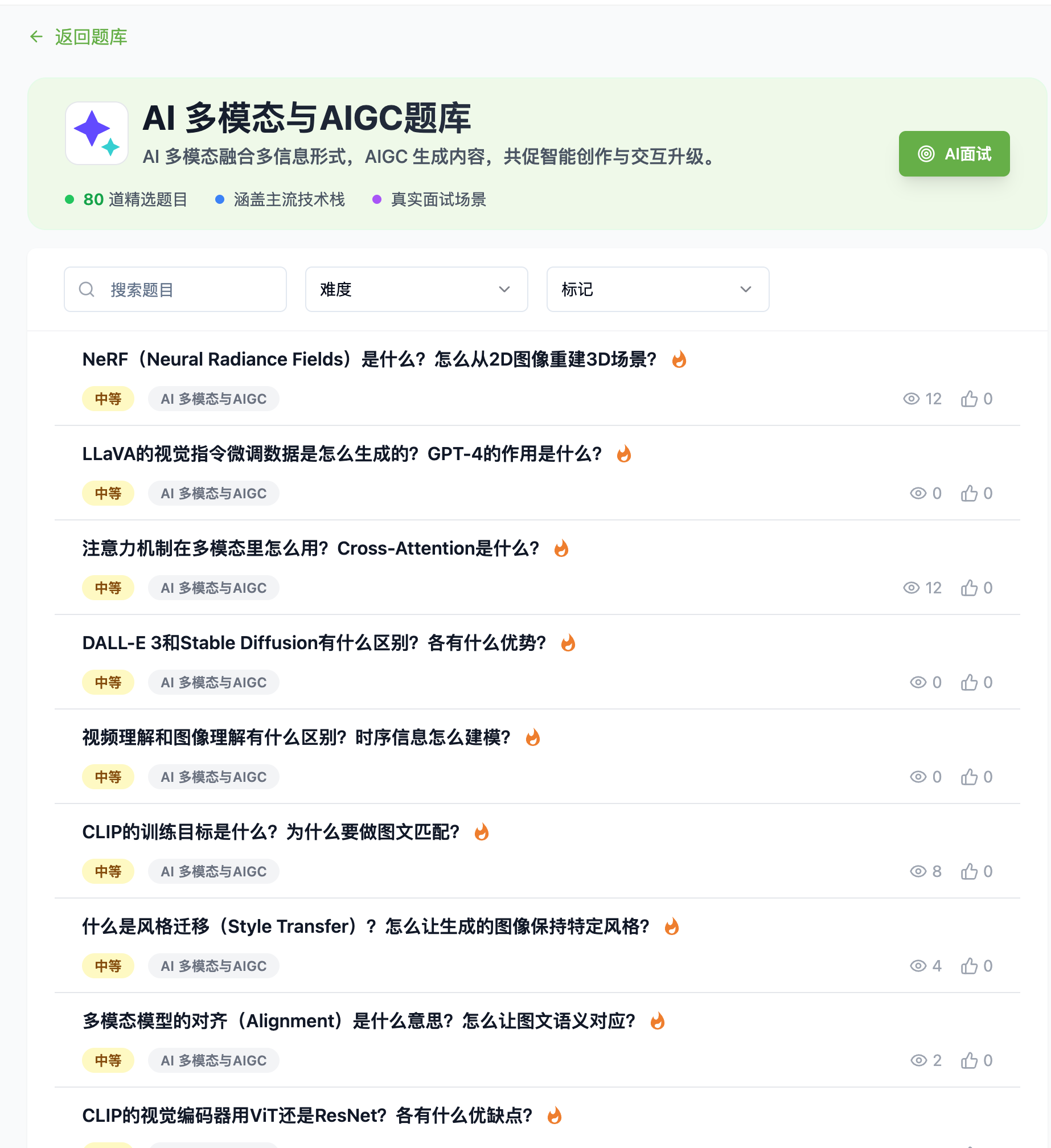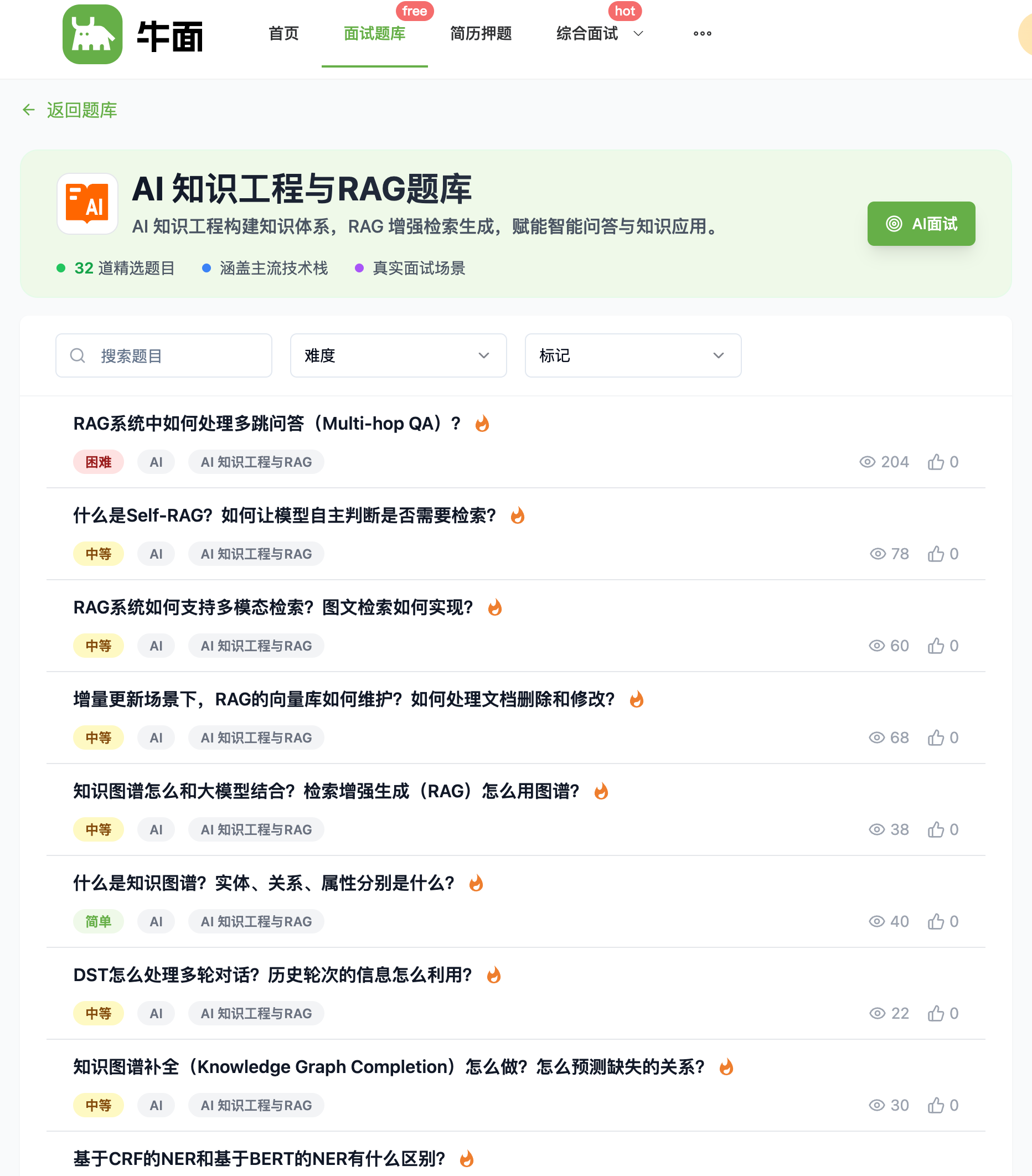 访问「niumianoffer.com (opens new window)」可以免费获取,顶部菜单选择【面试题库】,然后选择【AI题库】