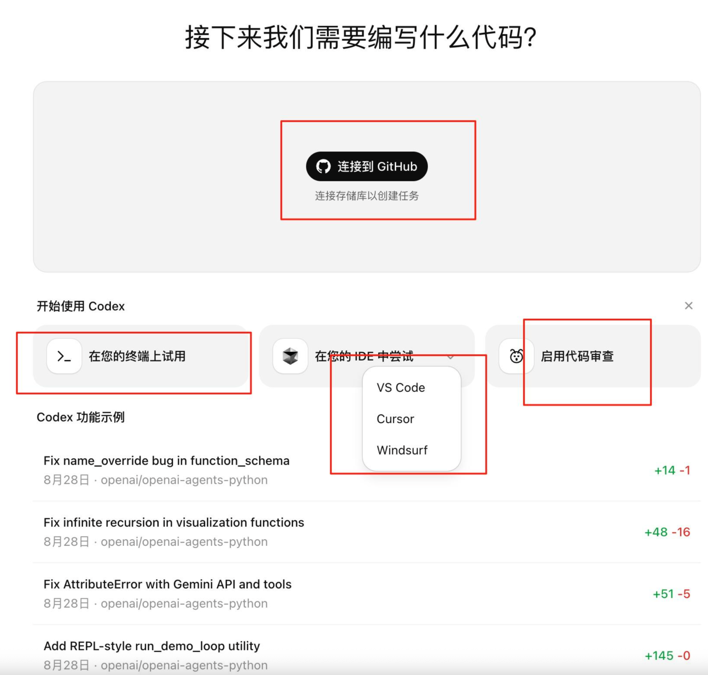 三种使用方式: Codex 网页版、IDE扩展、Codex CLI 终端。