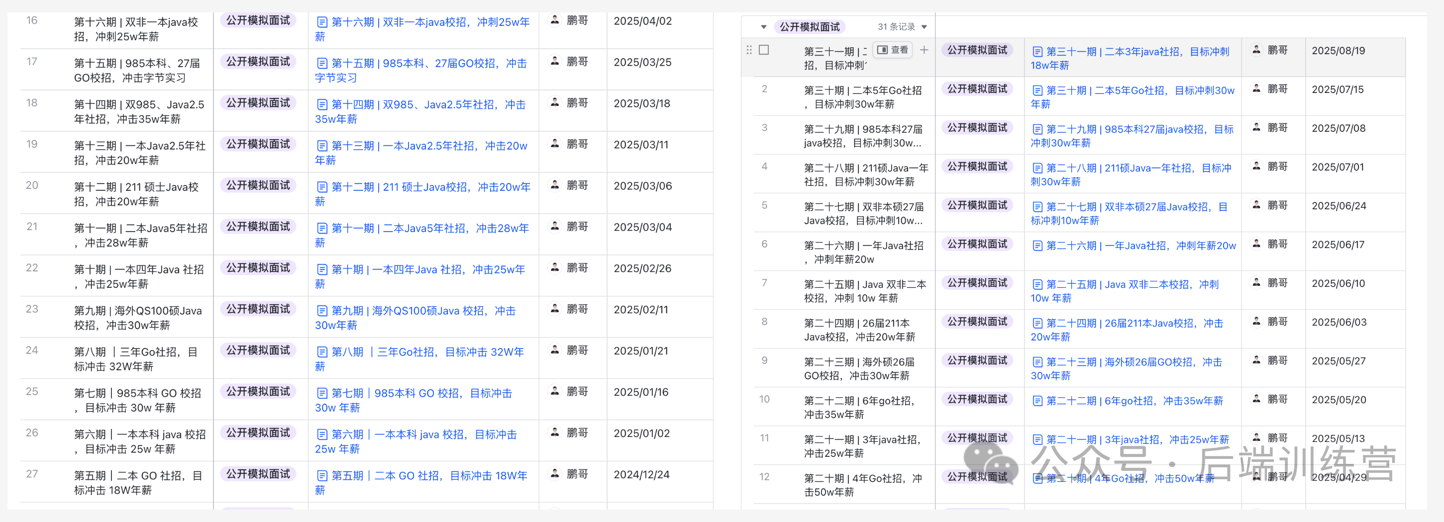 而且还有大厂面试官和学员公开模拟面试的直播,今年以来已累积沉淀了 30期+ 公开模拟面试直播,涵盖校招和社招的同学。