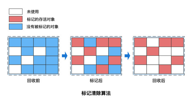 - 标记-清除算法:标记-清除算法分为“标记”和“清除”两个阶段,首先通过可达性分析,标记出所有需要回收的对象,然后统一回收所有被标记的对象。标记-清除算法有两个缺陷,一个是效率问题,标记和清除的过程效率都不高,另外一个就是,清除结束后会造成大量的碎片空间。有可能会造成在申请大块内存的时候因为没有足够的连续空间导致再次 GC。