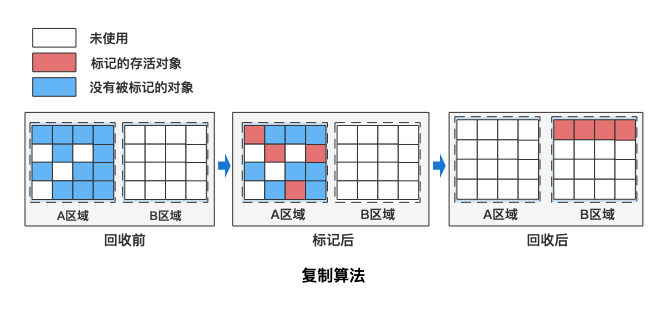 - 转移阶段,即把活跃对象复制到新的内存地址上;