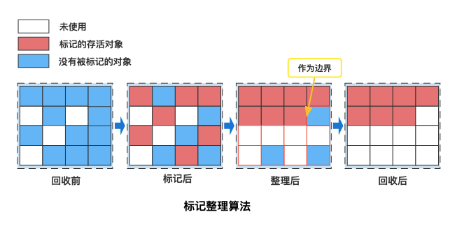 为了解决碎片问题,有 “标记 - 整理”:标记后不是直接清除,而是把存活对象往一端移动,然后清理边界外的内存,这样内存更整齐,但移动对象会有性能开销。