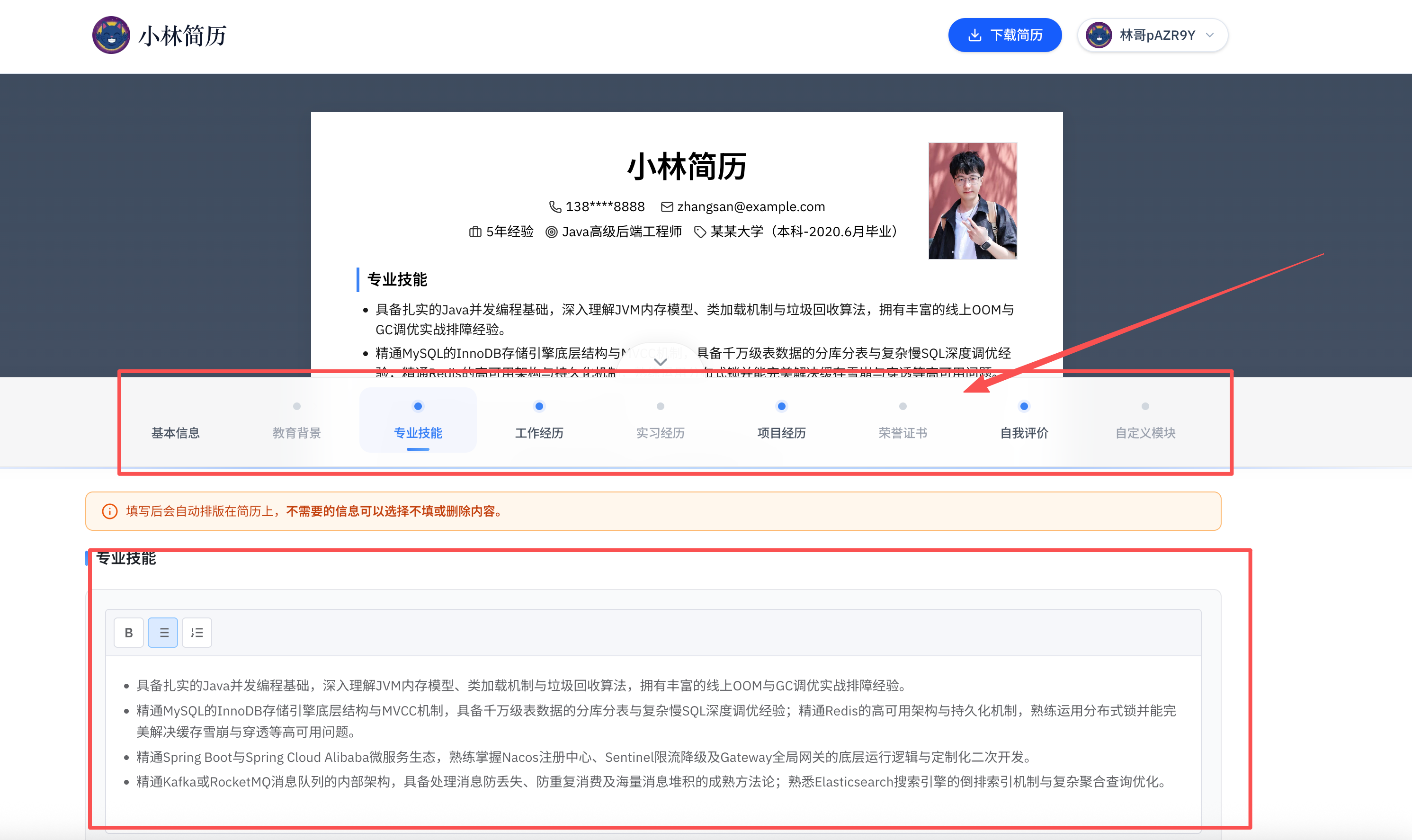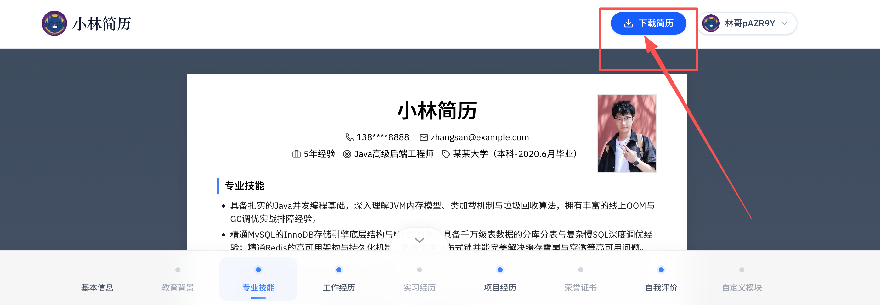 - 第三步: 内容填好后,直接点击右上角的「下载简历」,一份排版精美的高颜值简历就热乎出炉了!