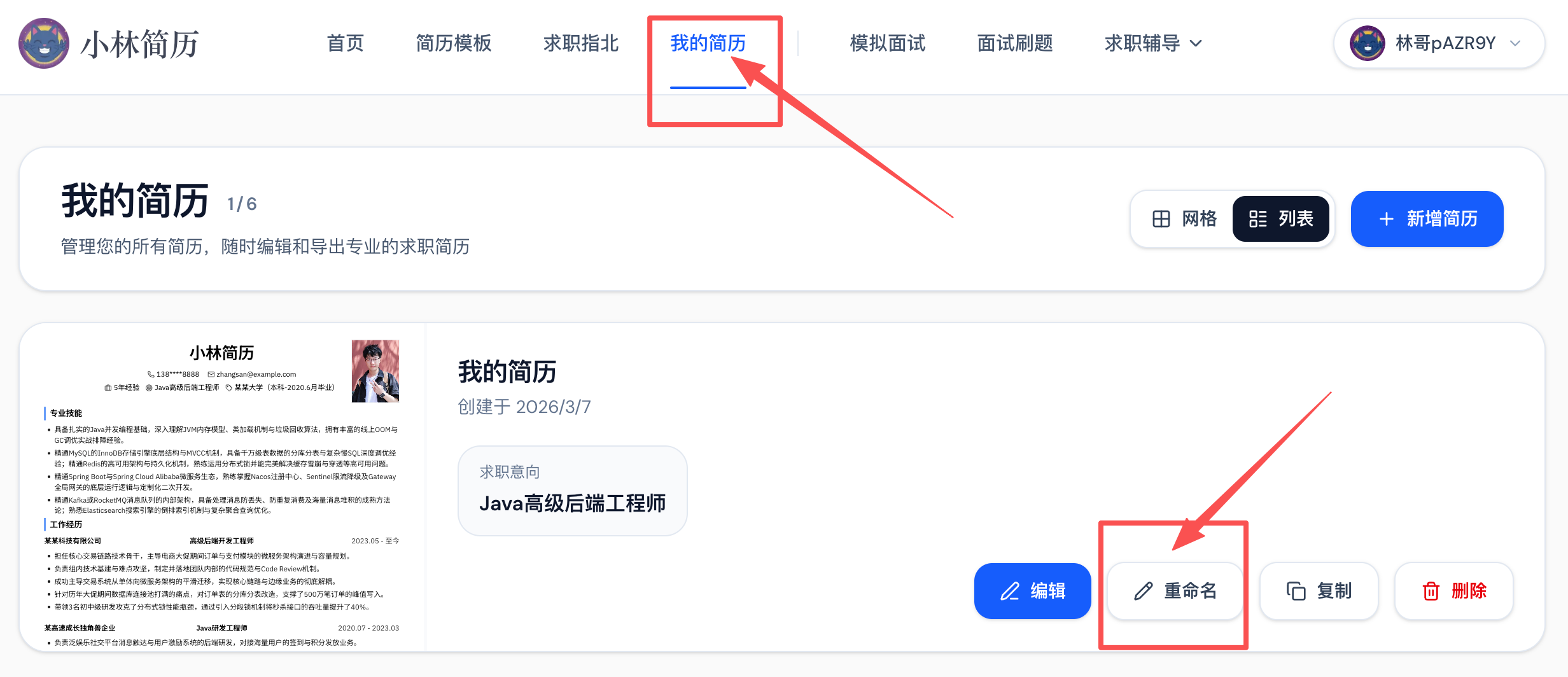 对了,简历文件名也很重要,如果大家想设置导出简历的 PDF 名字,可以在「我的简历」找到你的简历模版,然后点击「重命名」,你在这里改好的名字,就是最终导出 PDF 的文件名了。