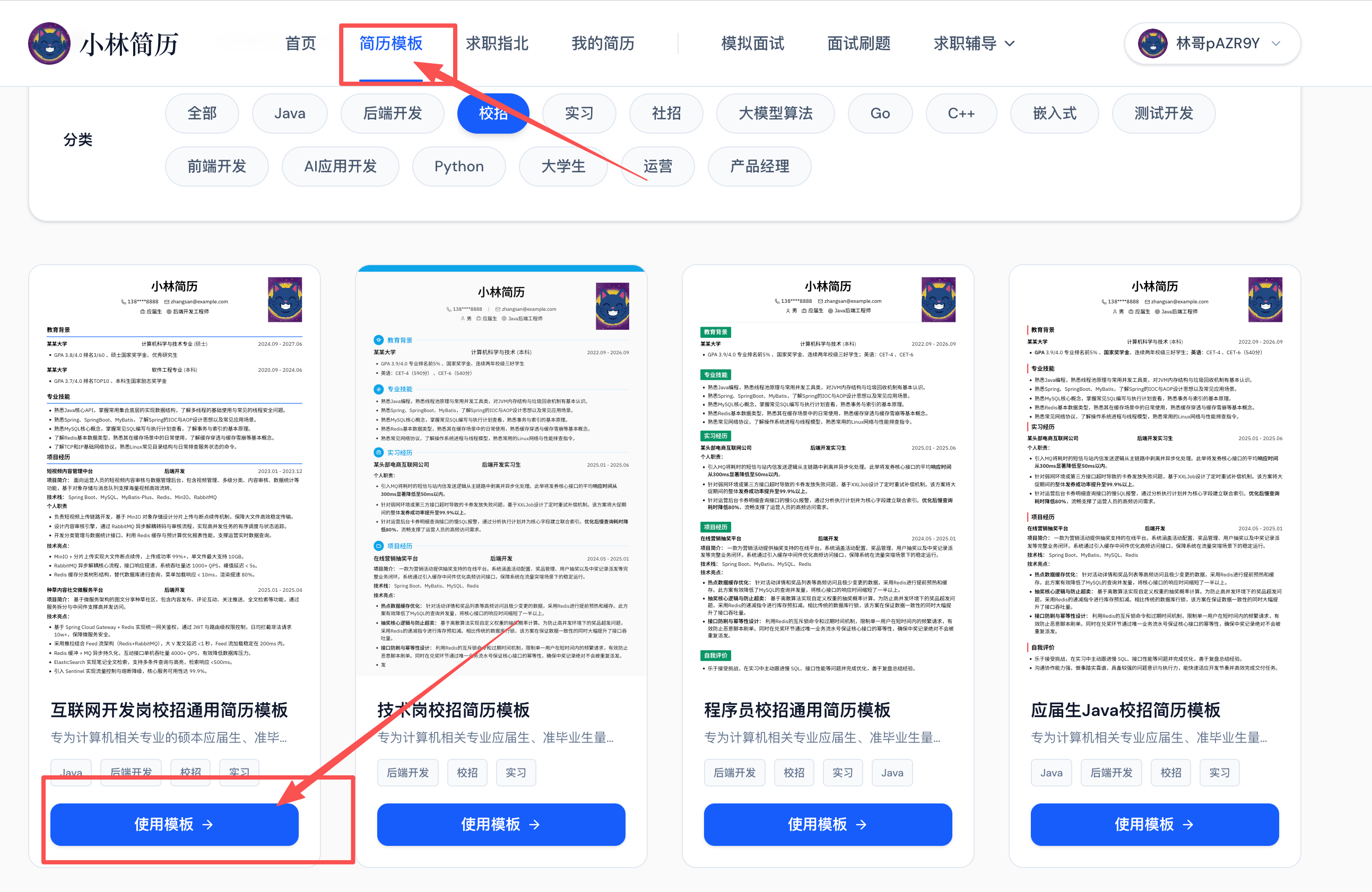 - 第一步: 电脑端浏览器打开网址 👉 https://jianli.xiaolinnote.com/ (opens new window) ,在首页找到你心仪的简历模版,直接点击「使用模版」。