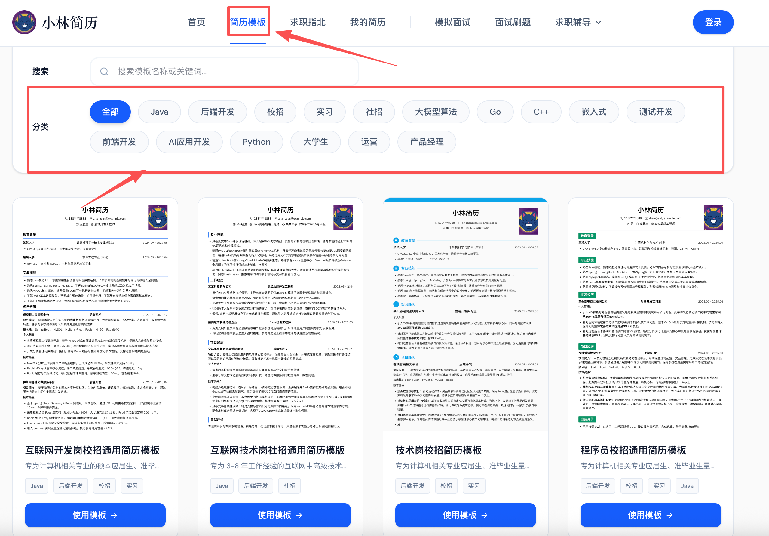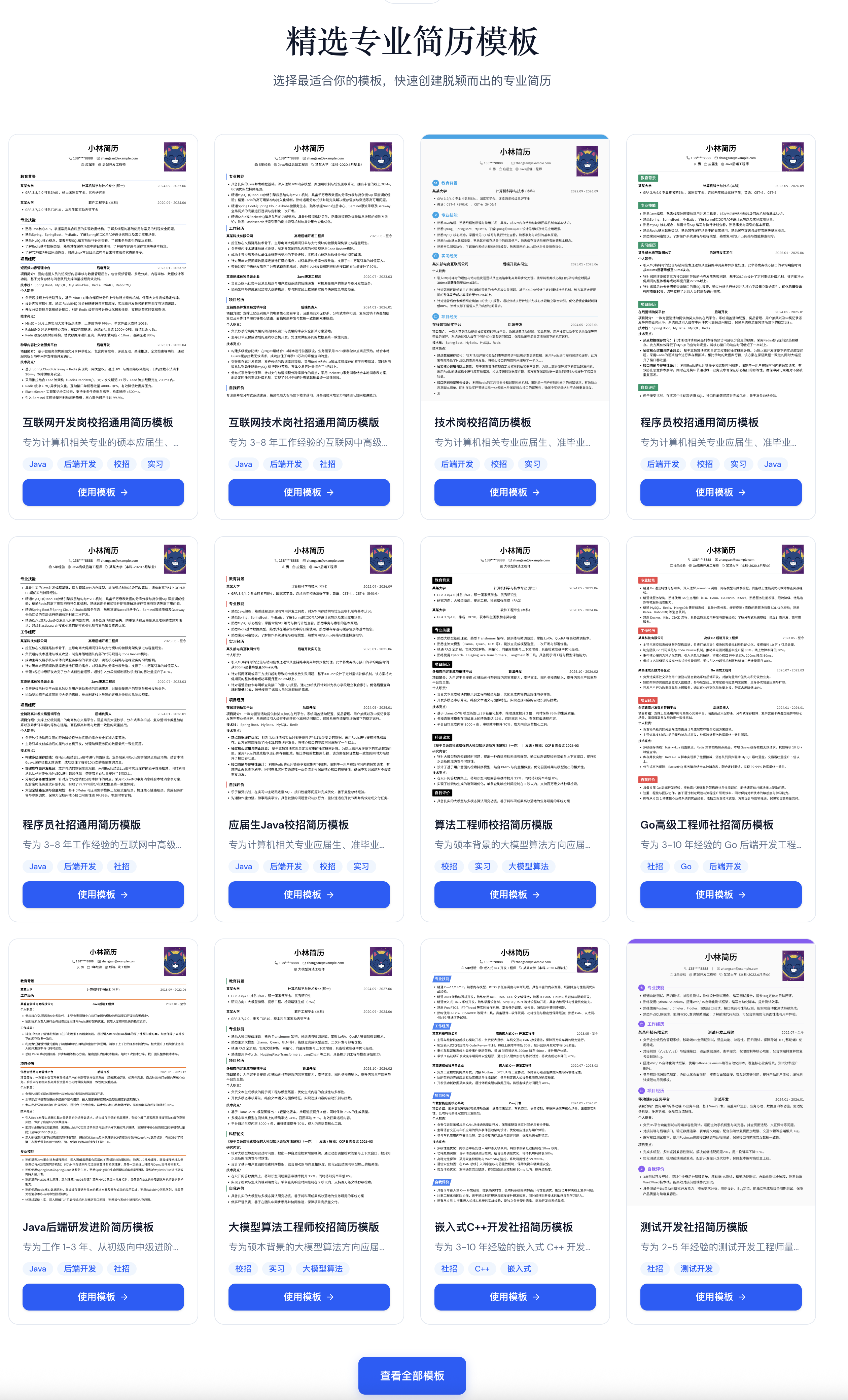 跟市面上那些冷冰冰的生成器不一样,「小林简历」是真正懂咱们技术人的。目前网站上提供了 20+ 精美的简历模板,而且针对各个技术方向做了细分定制