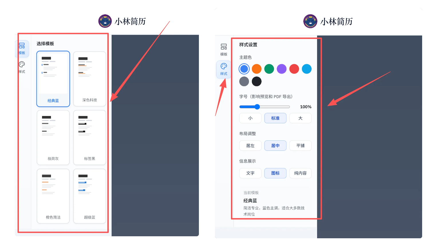 - 第二步: 接着就会进入简历制作页面。左侧有多种简历模版风格可以随时切换,模版的主题色也能换成你喜欢的颜色,字体大小支持自由缩放。